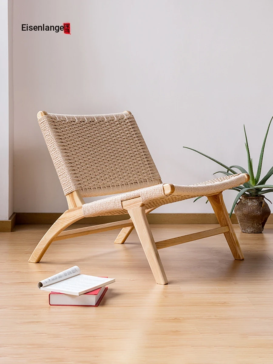 Aisenlongte Solid Wood Sofa Chair - Designer Single Seat in Rustic Rope Weave, Japanese Wabi-Sabi Style, Perfect for Relaxing on Your Balcony with Comfortable Back Support
