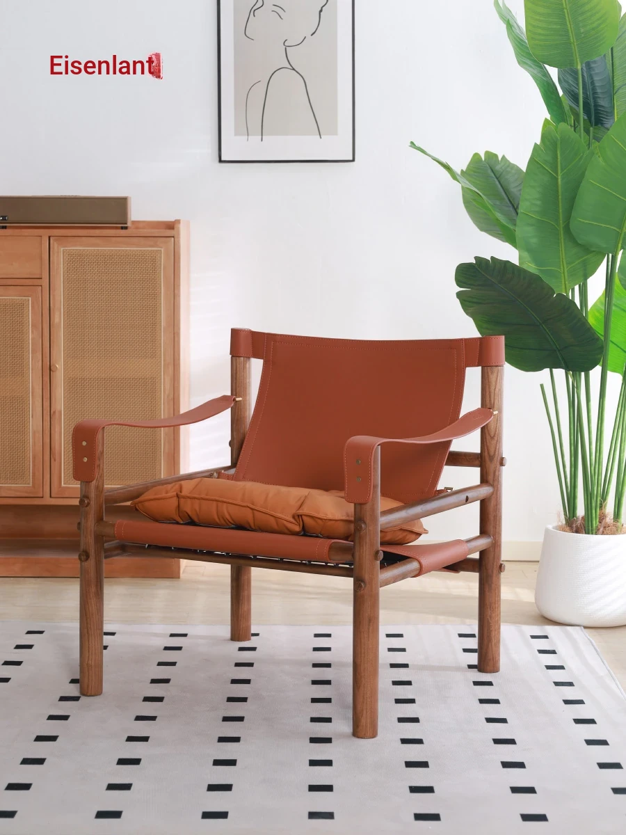 Eisenrant Nordic Vintage Solid Wood Sofa Chair - Designer's Choice for Home, Perfect for Balcony, Single Leisure Saddle Leather Hunting Chair