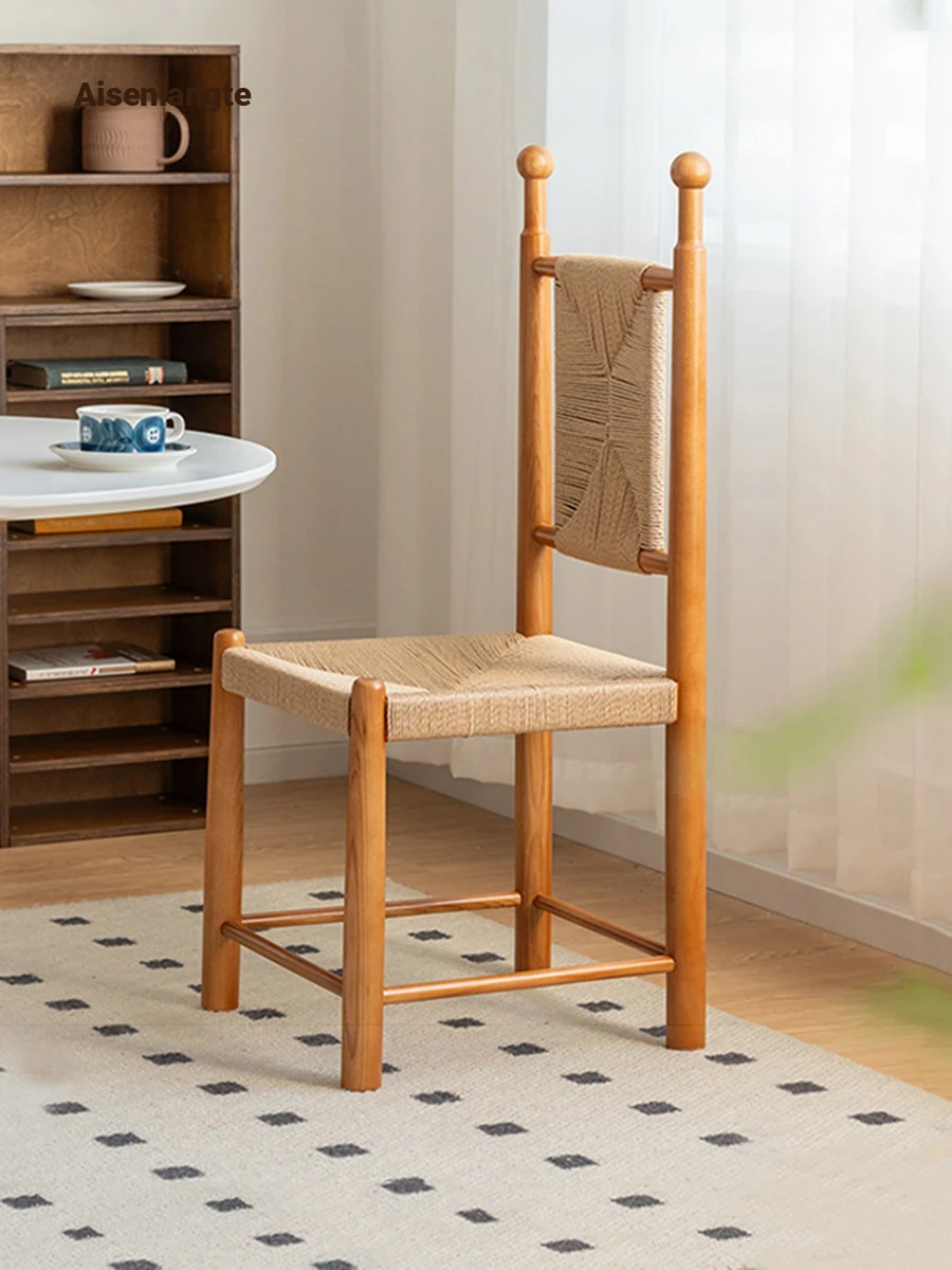 Nordic Vintage Solid Wood Dining Chair - Handwoven Backrest Stool for Home, Designer Wabi-Sabi Aesthetic, Perfect for Cozy Cafés and Guesthouses